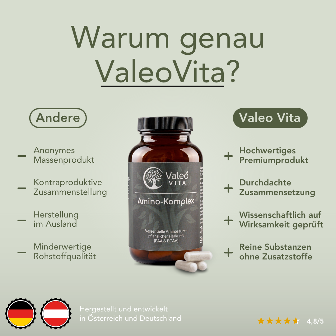 Unser Valeo Vita Amino-Komplex vereint alle 8 essenziellen Aminosäuren (EAA & BCAA) in einem optimalen physiologischen Verhältnis nach Prof. Dr. Luca-Moretti. Im Vergleich zu anderen Proteinprodukten zeichnet sich unser pflanzlicher Amino-Komplex durch eine schnelle Resorptionszeit, hohe Verdaulichkeit und Verträglichkeit sowie einen extrem niedrigen Kalorienanteil von nur ca. 0,2 kcal pro 5 Kapseln aus.