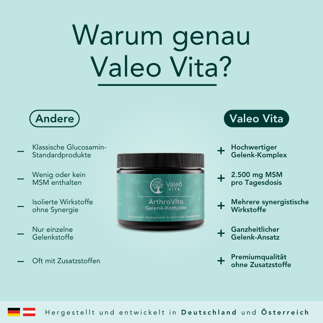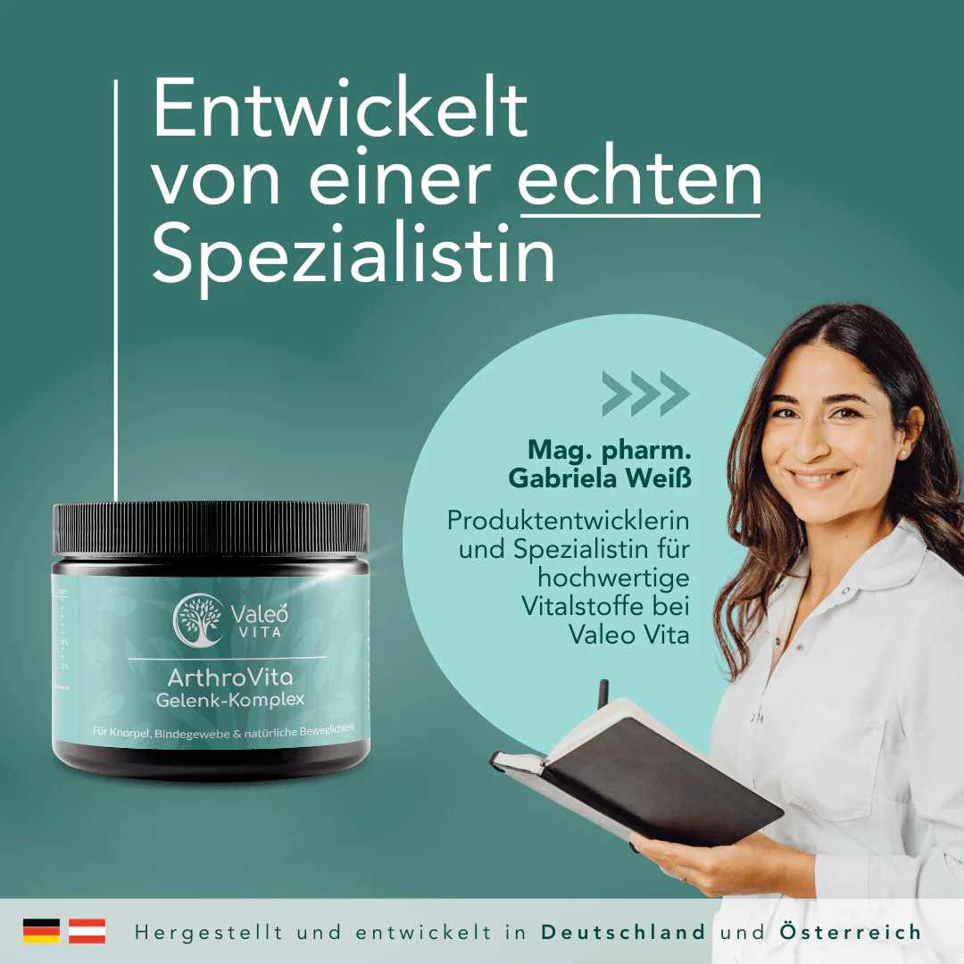 Arthro Vita wurde entwickelt, um den Körper in Phasen höherer Belastung oder zunehmenden Alters zu unterstützen. Die Formel kombiniert ausgewählte Mikronährstoffe, Aminosäuren und Pflanzenextrakte, die in der Ernährungswissenschaft häufig im Zusammenhang mit Gelenken, Knorpeln und Bindegewebe beschrieben werden.