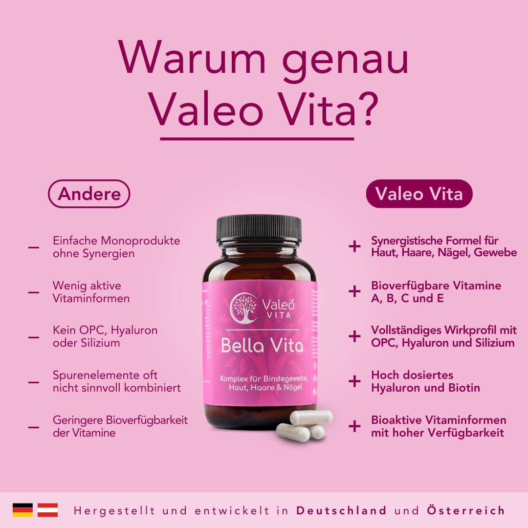 Unsere Bella Vita kombiniert sorgfältig ausgewählte Inhaltsstoffe zu einer einzigartigen Formel für die Erhaltung von Haut, Haaren, Nägeln und Bindegewebe. Der Schönheits-Komplex kann auch als Multitalent in vielerlei Hinsicht betrachtet werden. Neben Vitamin A, B, C und E sind Mineralstoffe und Spurenelemente wie Eisen, Zink, Kupfer, Selen und Silizium enthalten. Ergänzt wird die Formel durch Traubenkernextrakt, Ackerschachtelhalm-Extrakt und Hyaluronsäure, die das Zusammenspiel der Inhaltsstoffe hervorragend ergänzen.