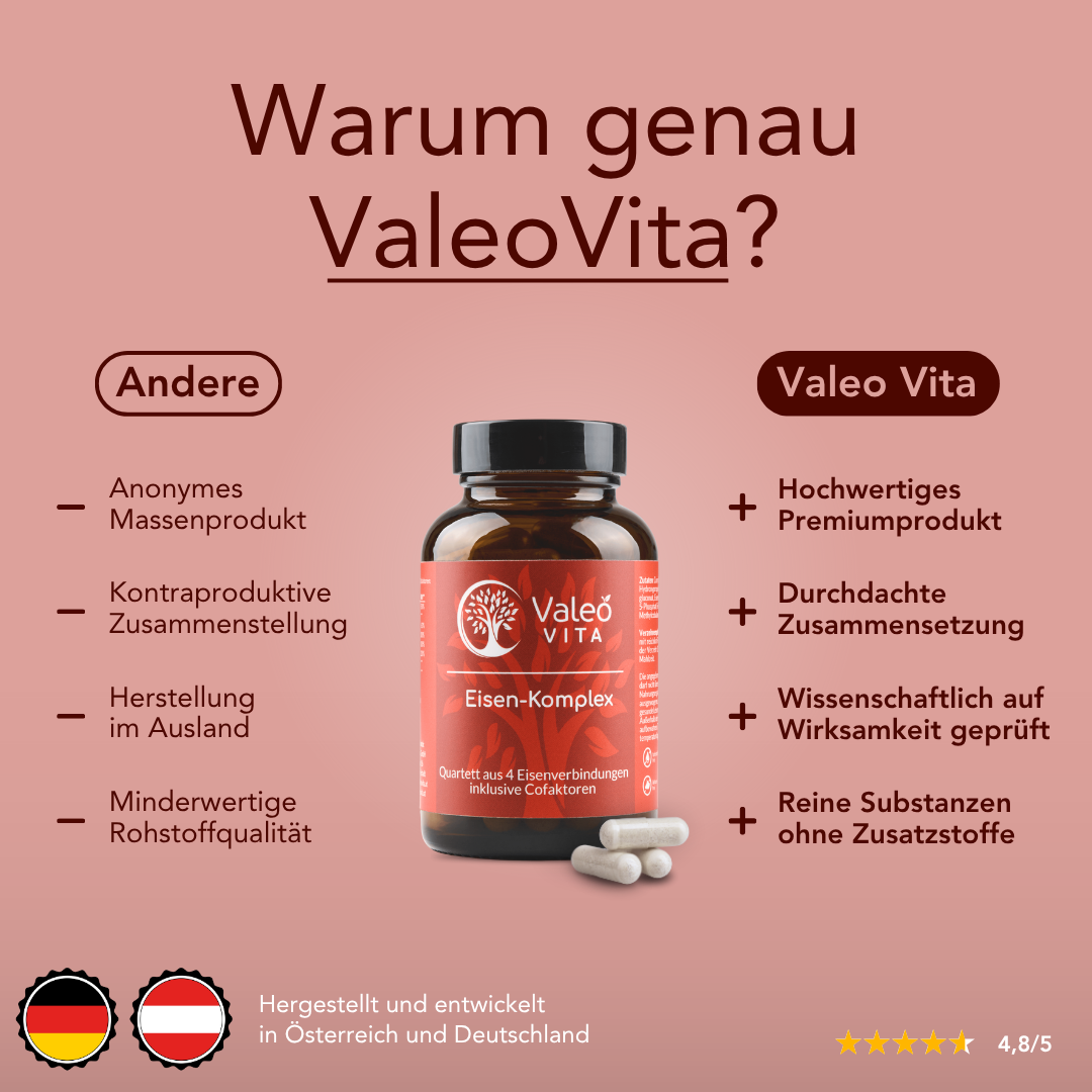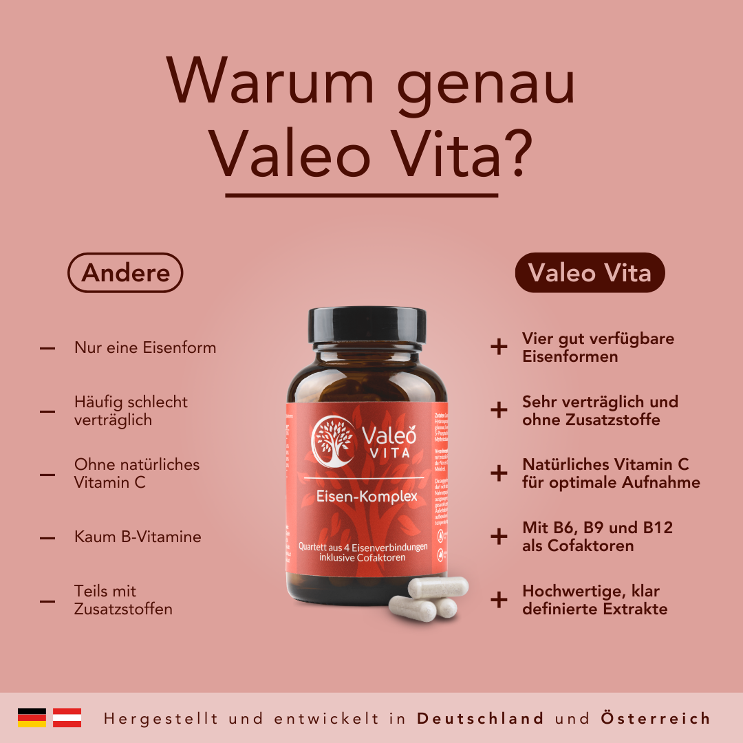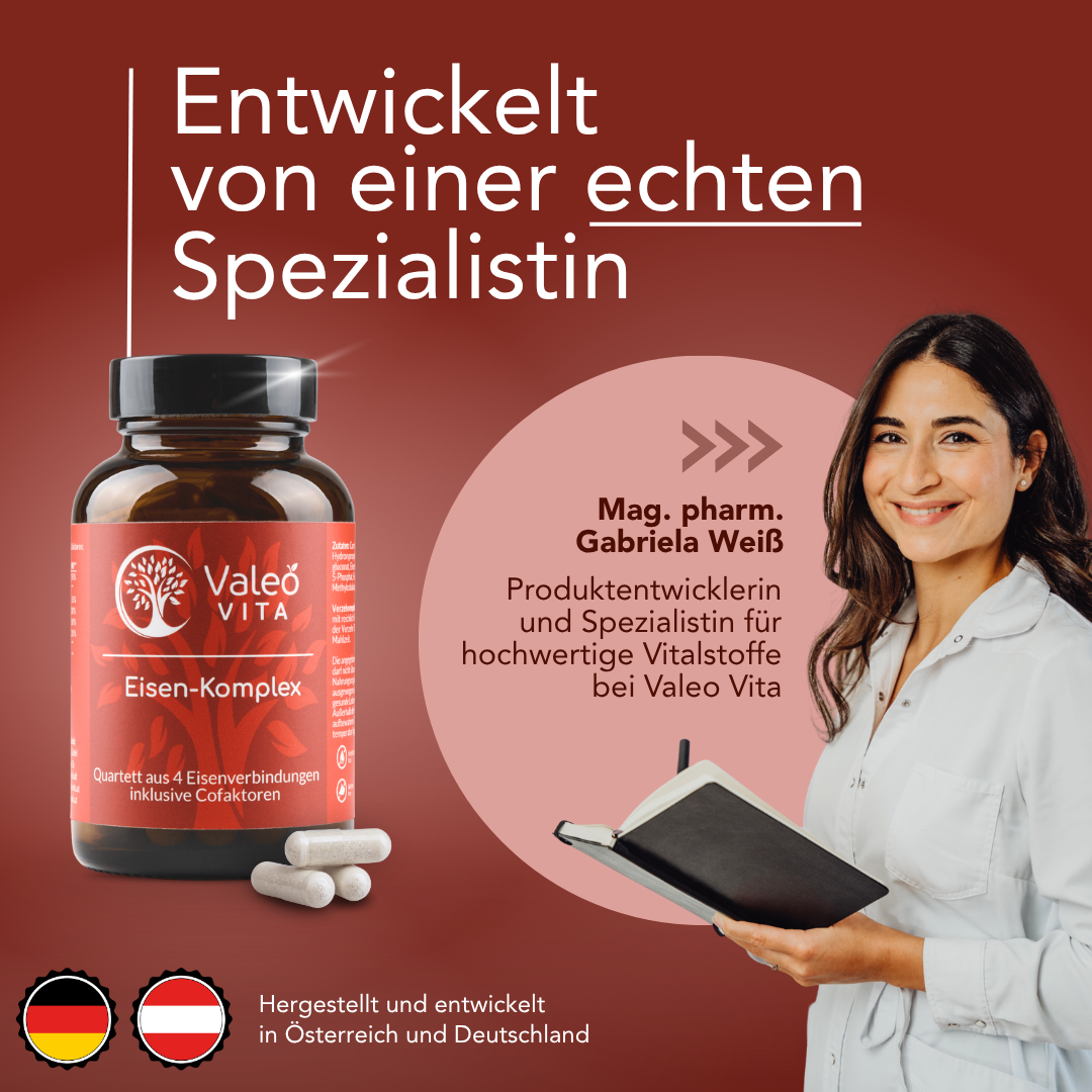Zusätzlich zu Eisen und Vitamin C enthält unser Produkt bioaktive Kofaktoren wie Vitamin B6, B9 und B12, die entscheidend für den Eisenstoffwechsel und die Bildung roter Blutkörperchen sind.