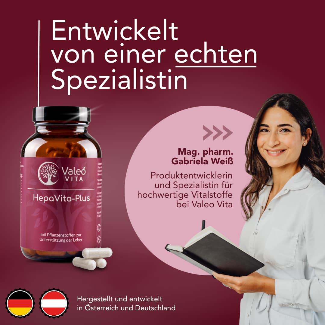 Unser Valeo Vita HepaVita Plus – Leberkomplex kombiniert bewährte Pflanzenextrakte mit N-Acetylcystein (NAC), Alpha-Liponsäure, Cholin, Inositol und Lecithin. Die bewährten pflanzlichen Inhaltsstoffe Artischocke, Mariendistel und Löwenzahn liefern natürliche Bitterstoffe, die traditionell schon lange genutzt werden. In der Artischocke ist besonders das Cynarin hervorzuheben, das zur Gruppe der sogenannten Kaffeesäurederivate gehört. Der Cynarin-Anteil in unserem Hepa Vita Plus ist standardisiert. Unser Mariendistel-Extrakt ist auf einen Silymarin-Anteil von 80 % standardisiert. Silymarin ist ein pflanzlicher Stoffkomplex aus den Früchten der Mariendistel.