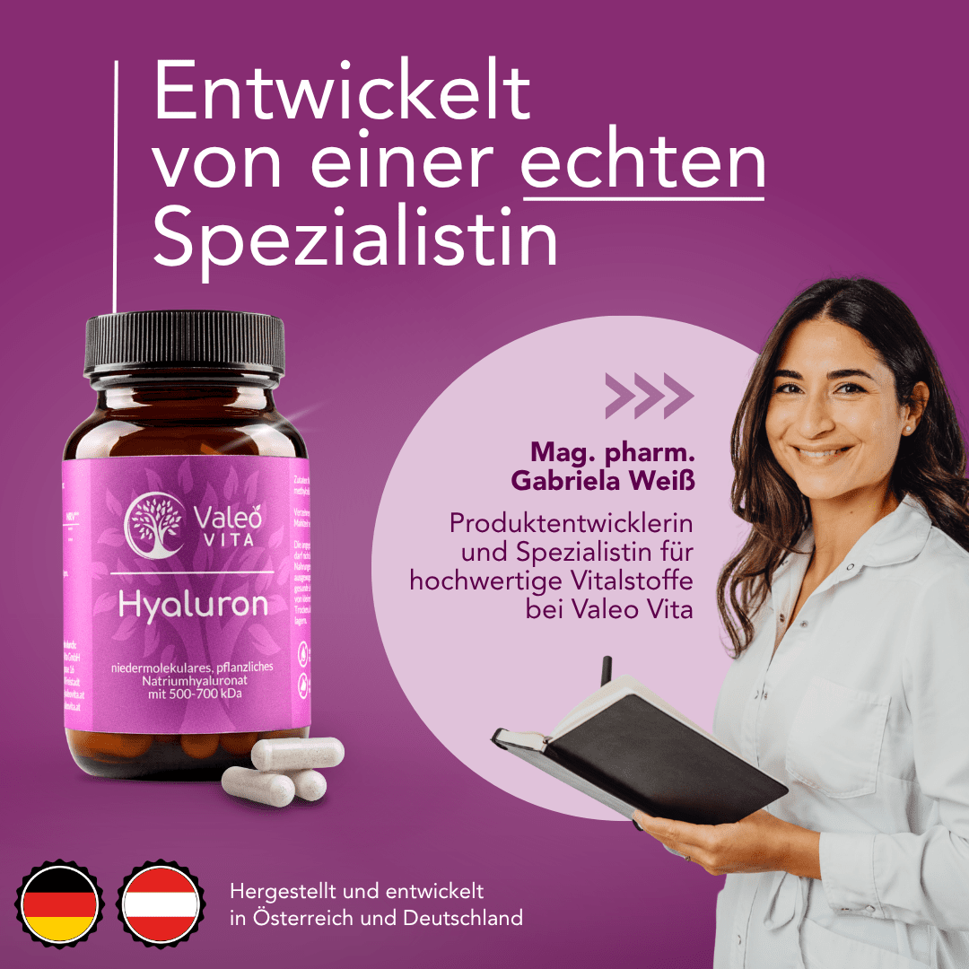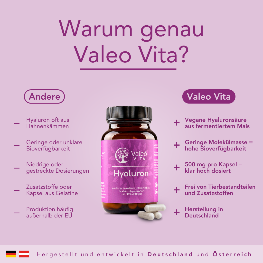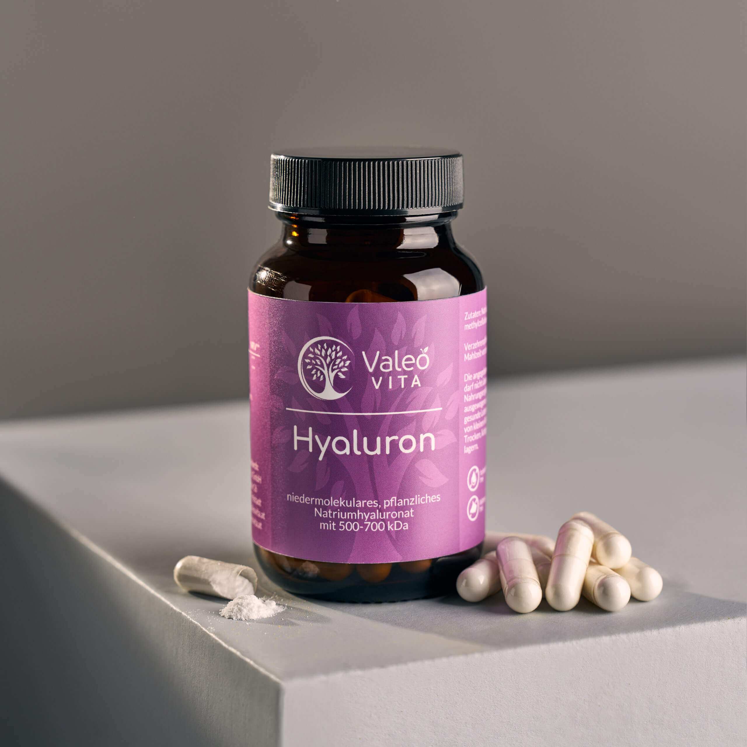 Unsere Valeo Vita Hyaluron Kapseln bieten eine hochwertige, vegane Quelle für Hyaluronsäure. Im Gegensatz zu herkömmlichen Präparaten, die oft aus Hahnenkämmen gewonnen werden, wird unsere Hyaluronsäure durch Fermentation von gentechnikfreiem Mais gewonnen. Jede Kapsel enthält 500 mg reiner Hyaluronsäure und bietet damit eine optimale Dosis zur Unterstützung des Körpers.