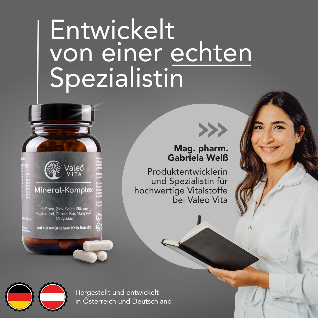 Viele der Inhaltsstoffe in unserem Mineral-Komplex sind über die alltägliche Ernährung schwer zu decken. So gelten Selen, Zink, Jod und Eisen laut der Deutschen Gesellschaft für Ernährung (DGE) als kritische Nährstoffe. Auch andere Spurenelemente, wie Silizium, sind für den Körper von Bedeutung – Silizium findet sich zum Beispiel im Bindegewebe, in der Haut, im Zahnschmelz und in den Knochen.