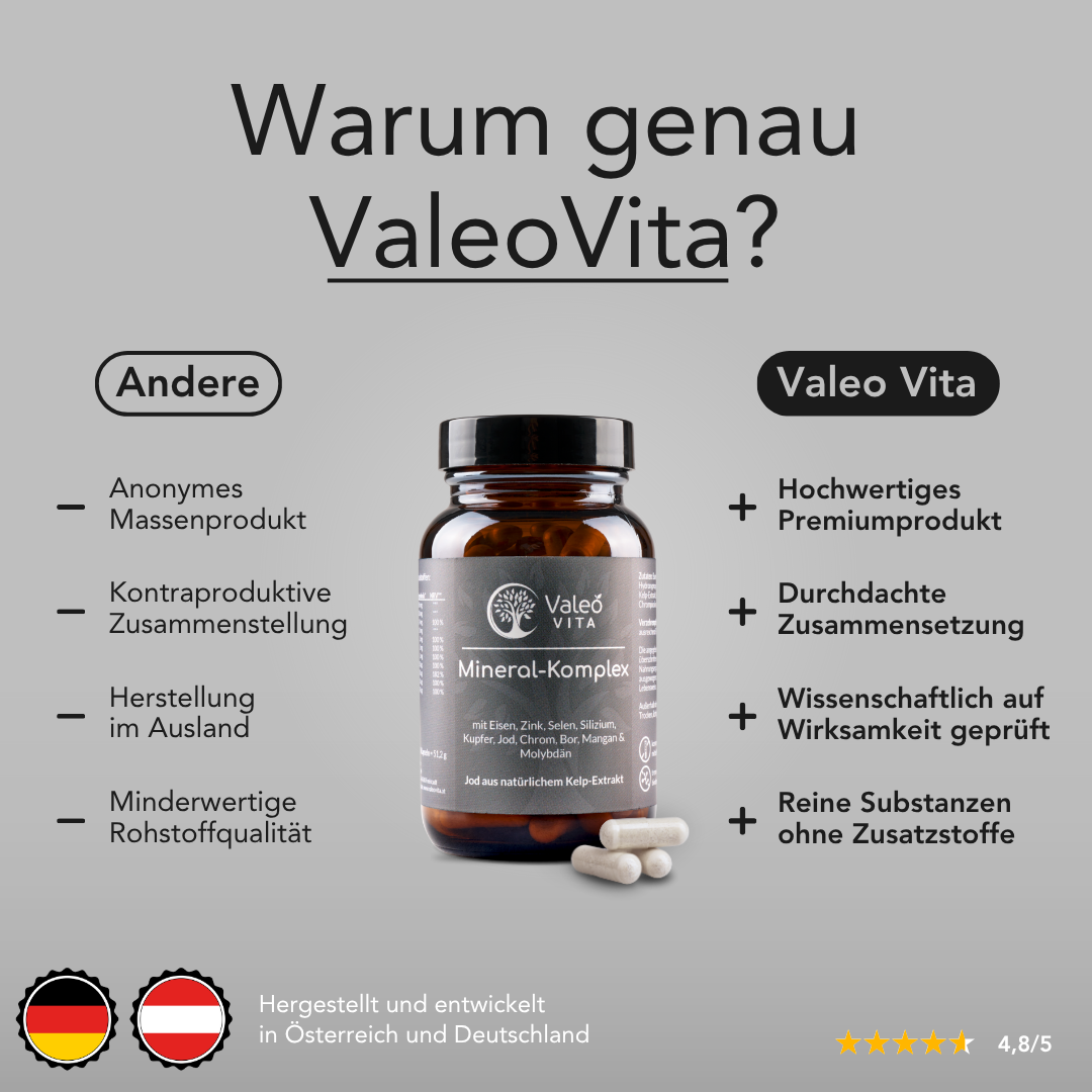 Unser Valeo Vita Mineral-Komplex bietet ein sorgfältig zusammengestelltes Ensemble aus 10 verschiedenen Mineralstoffen und Spurenelementen, die den Körper optimal unterstützen. Das ausgewogene Verhältnis der Inhaltsstoffe macht unseren Mineral-Komplex zu einem Allrounder für die tägliche Versorgung mit wichtigen Mineralien. Mit 90 Kapseln pro Packung reicht der Inhalt für drei Monate und sorgt so für eine praktische und kostengünstige Ergänzung Ihrer Ernährung.