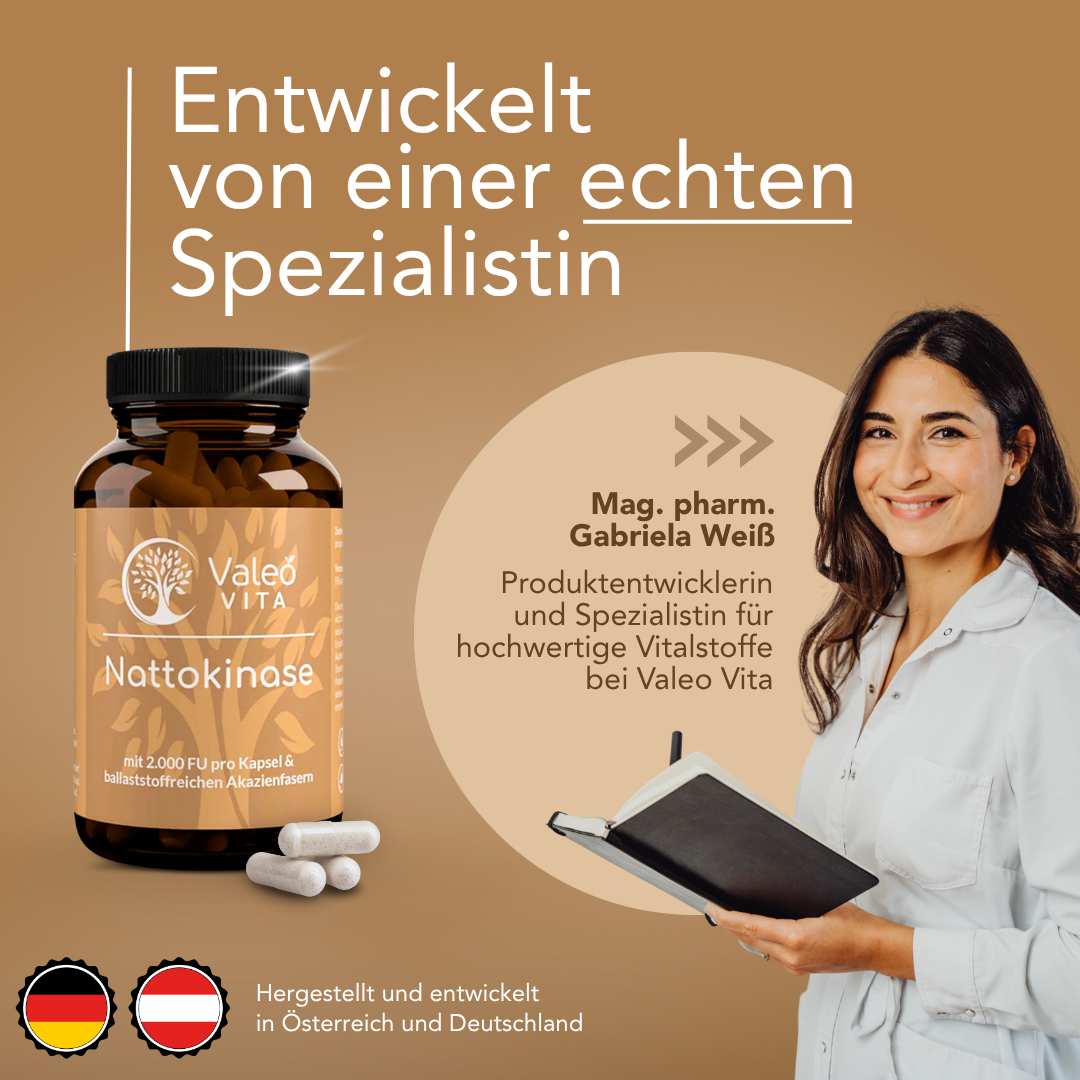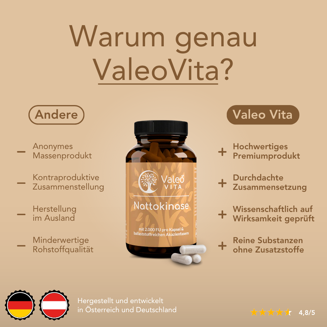 Für die Entwicklung unserer Valeo Vita Nattokinase Kapseln diente die natürlichste Quelle als Vorbild, nämlich das japanische Traditionsgericht Natto. Natto besteht aus fermentierten, grünen Sojabohnen und wird in Japan regelmäßig verzehrt. Wir legen großen Wert auf absolute Transparenz, um das Vertrauen unserer Kunden zu erhalten. Hier sind einige Gründe, warum unsere Kapseln herausragen: