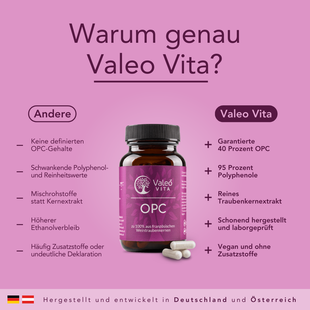 Eine Kapsel Valeo Vita OPC enthält 385 mg reines Traubenkernextrakt mit einem Anteil von 200 mg Oligomere Proanthocyanidine (OPC) aus den Kernen französischer Trauben. Die Qualität von OPC-Produkten auf dem Markt kann erheblich variieren, da der tatsächliche OPC-Gehalt oft schwankend ist oder lediglich der Polyphenol-Gehalt ausgewiesen wird. Polyphenole umfassen viele Einzelstoffe, wobei OPC nur einen Bruchteil davon darstellt. Unser hochkonzentrierter Pflanzenextrakt zeichnet sich durch einen garantierten OPC-Reingehalt von mindestens 40 % und einen Polyphenol-Gehalt von mindestens 95 % aus. Unser Produkt hebt sich durch seine Reinheit und natürliche Herstellung von herkömmlichen Produkten auf dem Markt ab.
