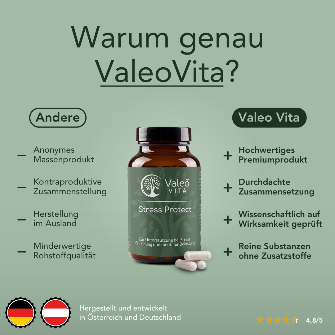 Das Leben fordert uns täglich – ob durch berufliche Anforderungen, emotionale Belastungen oder äußere Einflüsse. Valeo Vita Stress Protect wurde entwickelt, um Sie in solchen Phasen natürlich zu unterstützen. Die sorgfältig abgestimmte Kombination aus bewährten Pflanzenextrakten und Vitalpilzen und B-Vitaminen vereint das Wissen verschiedener Traditionen – von Europa über Asien bis nach Südamerika.