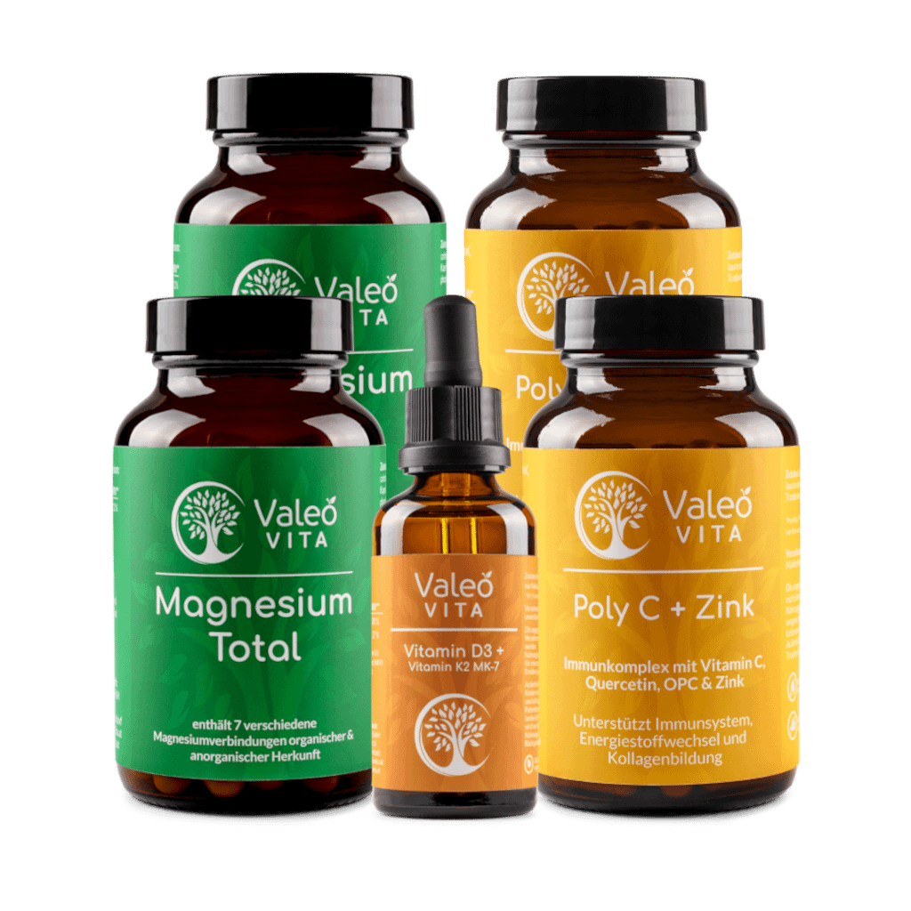 Knochengesundheit: Vitamin D3 ist für die Reifung und Aktivität von Knochenzellen unentbehrlich, sowie für die Mineralisation und Härtung des Knochens. Der Kofaktor des Sonnenvitamins, Vitamin K2, ist ebenfalls maßgeblich für den Knochenstoffwechsel. Es ist an der Aktivierung von Proteinen beteiligt, welche benötigt werden um Kalzium in die Knochen zu transportieren. Das fettlösliche Vitamin K2 trägt also zu Knochenfestigkeit, Knochendichte, Mineralisation und Regulation des Knochengewebes bei. Nähere Information finden Sie in unserem Kompetenzzentrum. Magnesium trägt zu einer normalen Aufnahme von Kalzium und Phosphor bei und damit zur Erhaltung normaler Knochen und Zähne. Etwa 50-70 % des Gesamtkörperbestandes an Magnesium befindet sich im Knochen. Vitamin C nimmt eine Schlüsselrolle in der Kollagensynthese ein und ist daher wichtig beim Aufbau und Erhalt von Haut, Bindegewebe, Knochen und Zähnen.