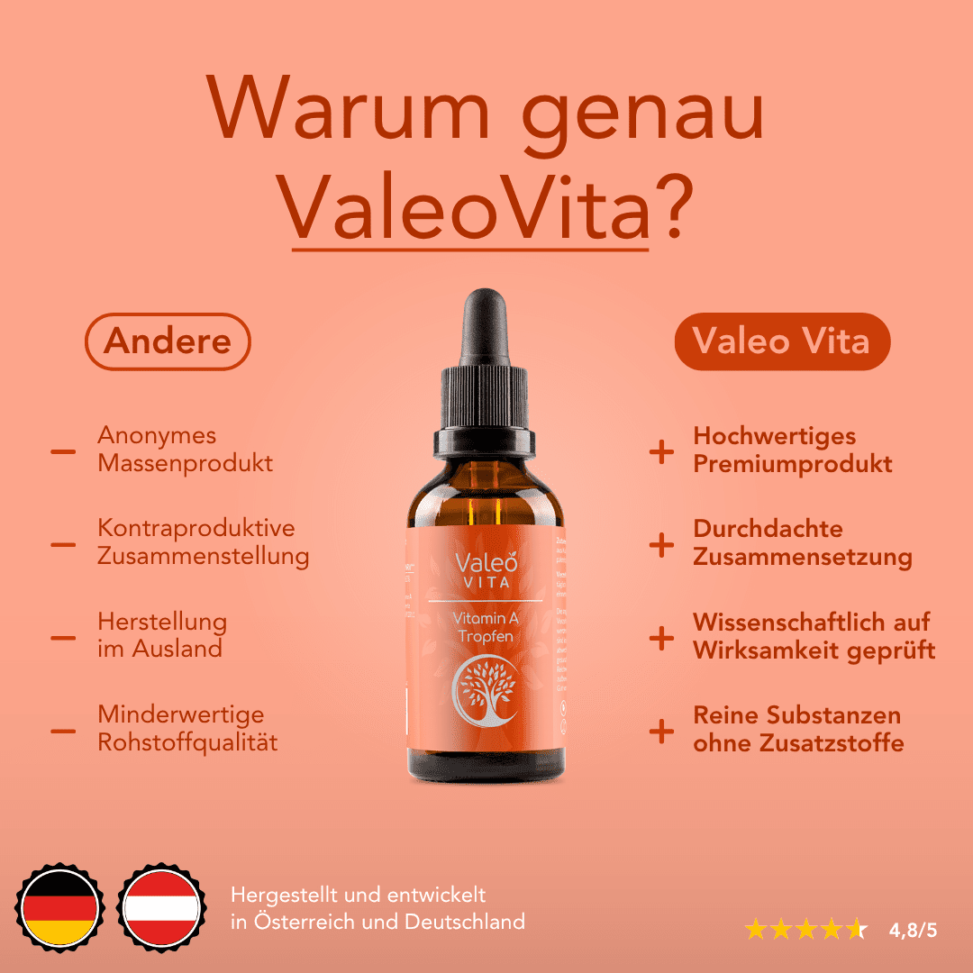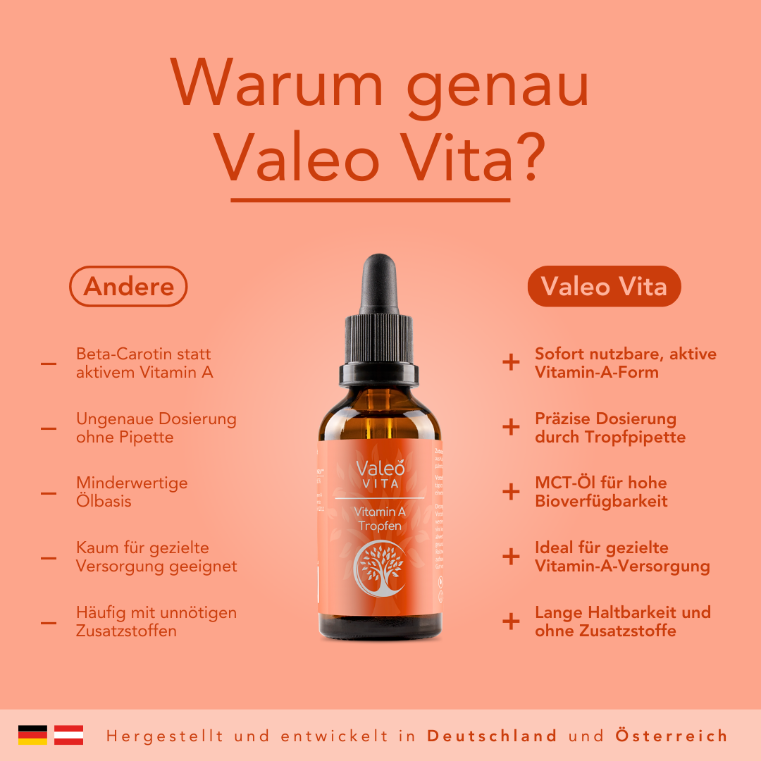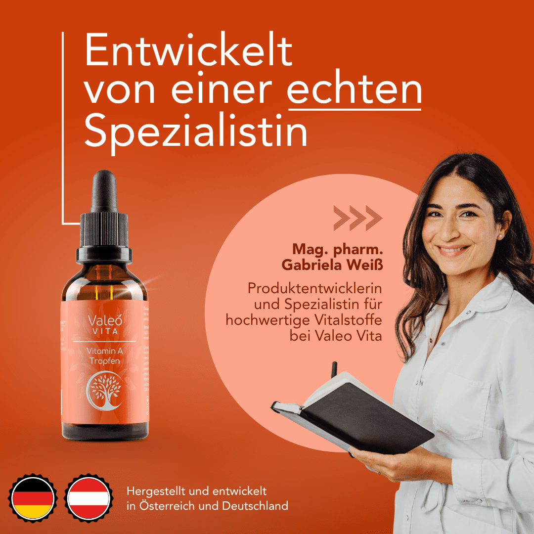 Vitamin A ist ein fettlösliches Vitamin, das dazu beiträgt, dass unsere Haut und Schleimhäute gesund bleiben, die Sehkraft erhalten bleibt und unser Immunsystem richtig funktioniert. Auch bei der Zellteilung – also der Erneuerung und dem Wachstum von Körperzellen – trägt Vitamin A zu einem normalen Prozess bei. Vitamin A ist ein essenzielles Vitamin, das zahlreiche wichtige Funktionen im Körper erfüllt. Die ausreichende Versorgung mit Vitamin A unterstützt verschiedene normale Körperfunktionen und sollte daher gegeben sein.