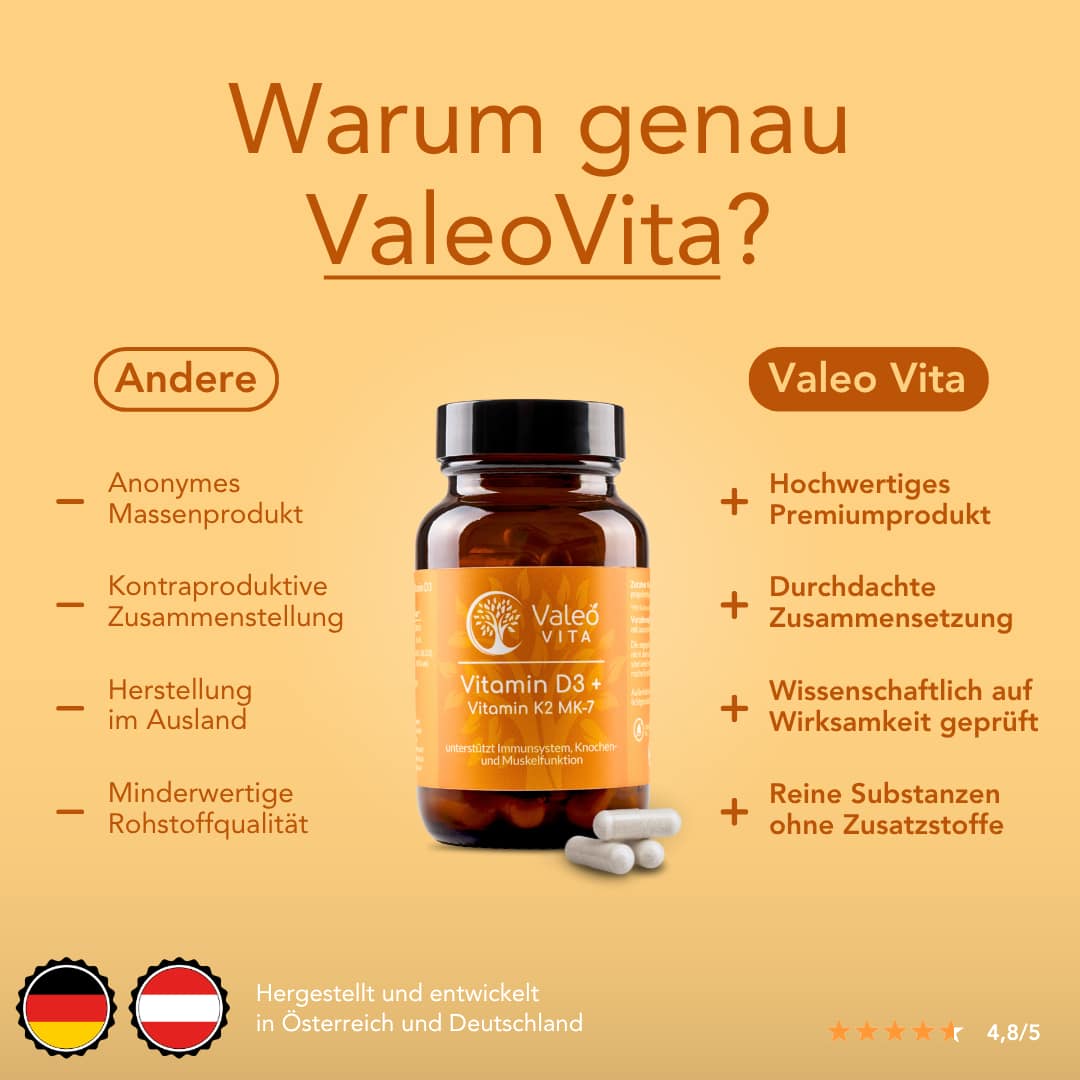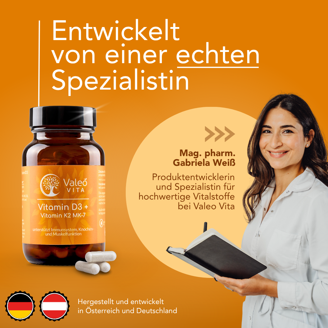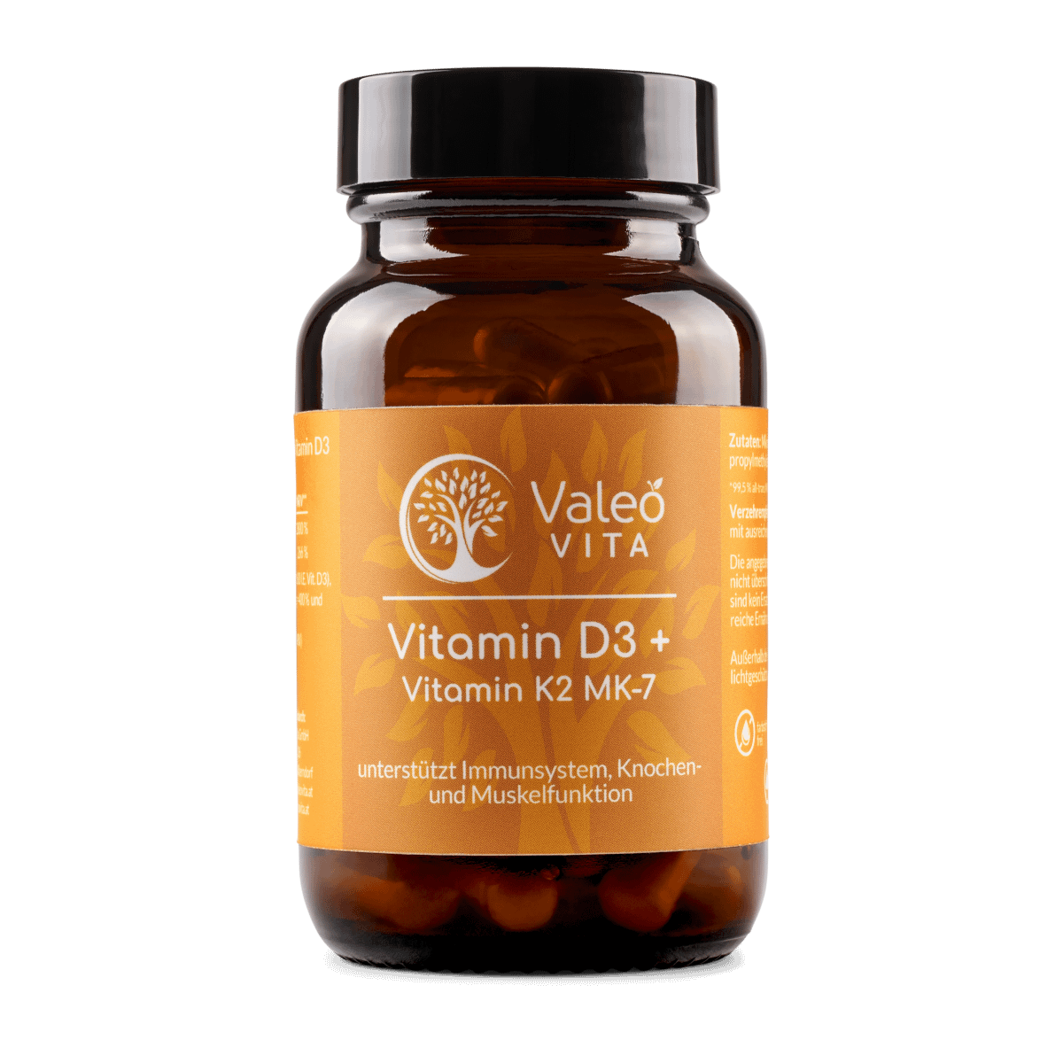 Valeo Vita Vitamin D3 wird auf natürlichem Weg aus Lanolin (Wollwachs) gewonnen. Diese schonende Herstellungsmethode sorgt für eine hohe Bioverfügbarkeit und eine gute Verträglichkeit. Vitamin K2 MK-7 in unseren Kapseln besteht zu 99,5 % aus all-trans Isomeren, die für eine optimale Aufnahme im Körper entscheidend sind. Unser Vitamin K2 wird aus pflanzlicher Basis (Natto) gewonnen und zeichnet sich durch seine hohe Wirksamkeit und Stabilität aus.
