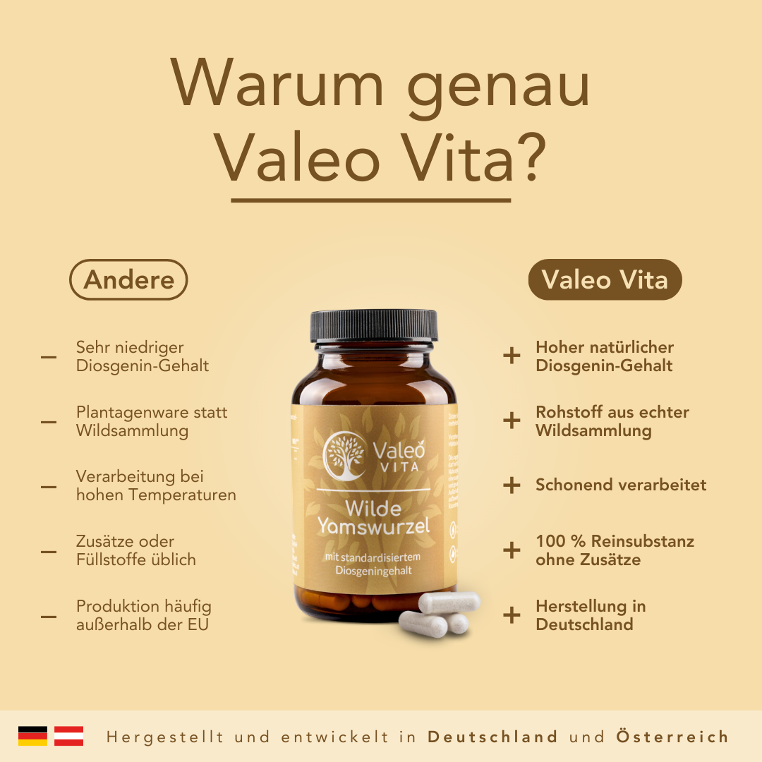 Die verwendeten Yamswurzeln stammen aus Wildsammlung, und die gesamte Produktion erfolgt nach höchsten Qualitätsstandards. Transparenz und Nachhaltigkeit zeichnen die Valeo Vita Produkte aus, wodurch ein hochwertiges, veganes Produkt in Rohkostqualität gewährleistet wird.